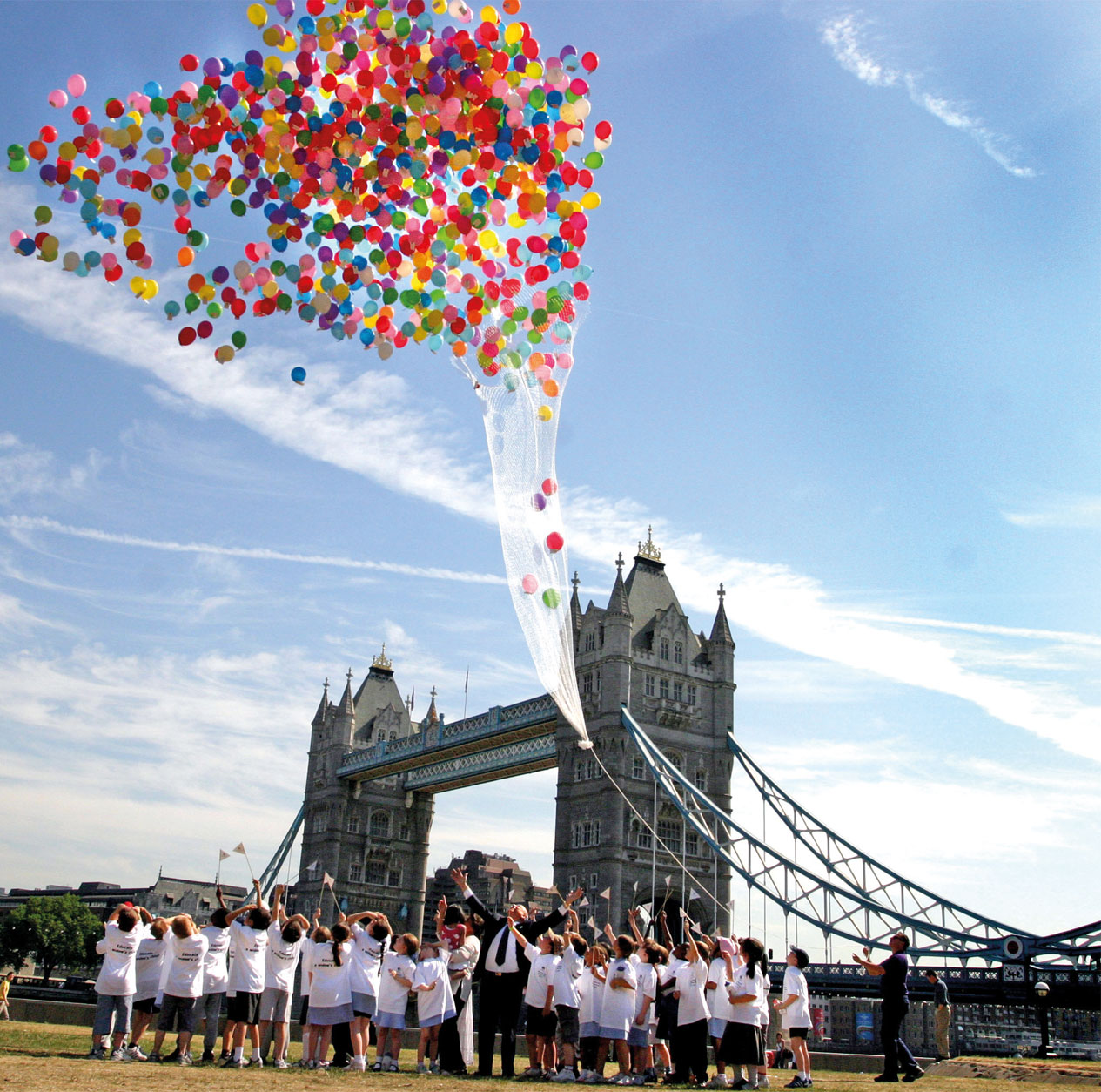The first International Widows Day: Raj Loomba and local school children release 1,000 coloured balloons at Tower Bridge London 23 June 2005.